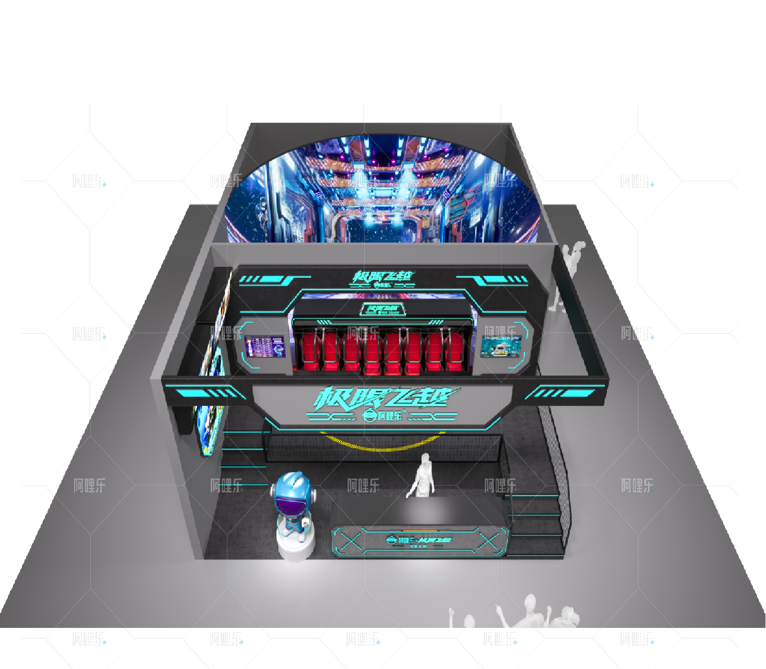 全景旋轉沉浸式體驗,多自由度全方位動感平臺,精準模擬前傾、后仰、左傾、右傾、墜落、顛簸!更有專門針對眩暈研發的上升、下降動作,徹底解決眩暈體驗,極限飛越動作幅度更大,動感體驗更刺激,可定制精品體驗內容,耳風、噴氣、吹風、閃光、震臀、震背等體驗特效等環境特效。題材豐富、交互性強,立體環繞音響,包圍式音效;盡亨突破次元壁壘的神奇之旅。